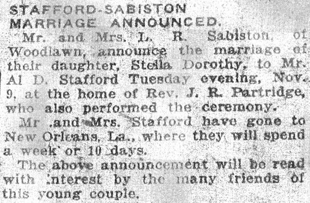 Allen Driver Stafford was Dorothy's first husband, and according to one magazine article, her high school sweetheart. They were married in Birmingham Alabama by Rev. J.R. Partridge on Tuesday evening November 9, 1920. Afterwards they went to New Orleans for their honeymoon.