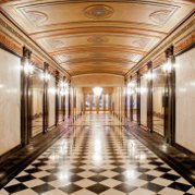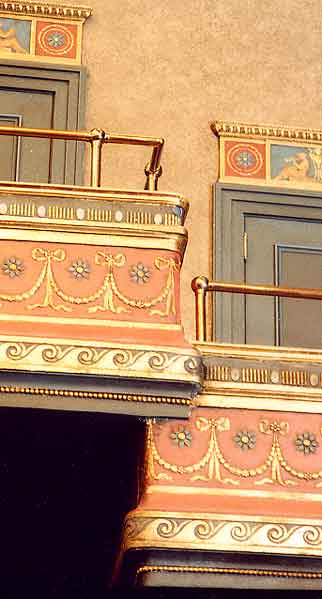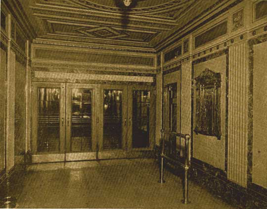 | Apollo Theatre 223 W. 42nd Street, New York, NY 10036 Also known as Bryant, Minsky's Burlesque, New Apollo, Academy Originally opened in 1910 as the Bryant, a vaudeville and movie house, this theater was acquired ten years later by the Selwyn brothers. The theater was rebuilt, renamed the Apollo, and given a new neo-classical/Georgian style colonnaded facade on 42nd Street, which it would share with the Selwyn's Times Square Theatre next door. The theaters were both designed by architect Eugene DeRosa. The Apollo could seat 1197 and was designed in Adam style, with 675 seats on the orchestra level, 495 in the balcony, and 27 in the boxes. |